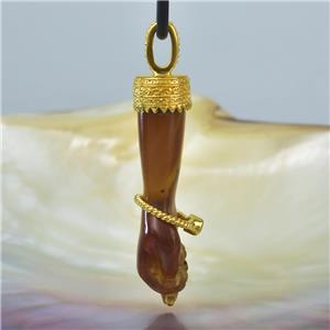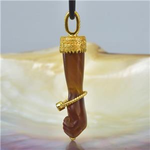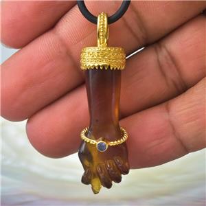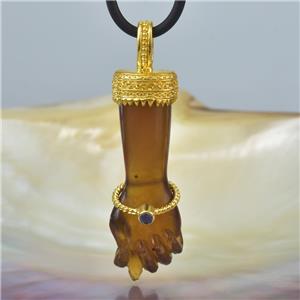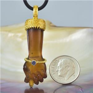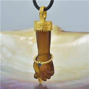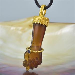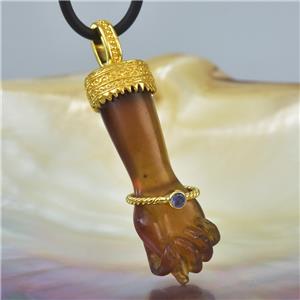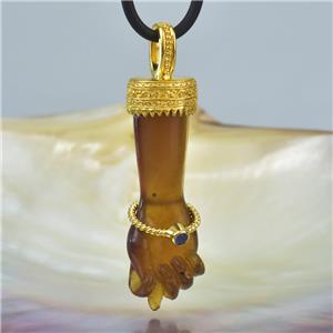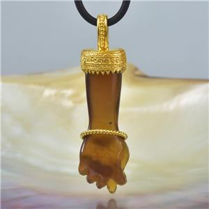 | | | | MANO FICO FIGA PENDANT GOLD VERMEIL over STERLING SILVER, AMBER & TANZANITE | | | | Item # | : | 183 0039 | | | | Type of carving | : | Natural Sumatra / Indonesia Amber carving protective talisman pendant (amulet / charm) | | | | Design | : | Exceptionally fine and realistic carved human hand design wearing a bracelet set with a genuine gemstone ~ 3-dimensional carving. The hand is mounted in a beautiful 18K Gold Vermeil Sterling Silver setting. | | | | Material | : | Genuine natural Sumatra Amber and 18K Gold Vermeil over genuine solid Sterling Silver ~ 18K gold-plated / 3-microns. The bracelet is set with a genuine natural Tanzanite gemstone. | | | | Gemstone | : | The bracelet is set with a genuine natural blue Tanzanite gemstone (gently heated) ~ round 1.8 mm diameter, brilliant cut in excellent quality with just minor natural inclusions (si) ~ from Tanzania / Africa | | | | Plating | : | Very thick and durable ~ 3-microns 18K yellow Gold Vermeil over solid 925 Sterling Silver | | | | Amount | : | 1 (one) individual piece * All photos are taken from the actual item * | | | | Weight | : | approx. 5.60 grams | | | | Size | : | Length / height: approx. 49.17 mm = 1.93 inches Width: approx. 13.57 mm Depth: approx. 10.30 mm All measurements are taken at the widest points | | | | Bail | : | This Mano Fico pendant has a bail inside measurement of 3.00 x 6.50 mm diameter and will fit a chain, rope or cord with a diameter of 2.90 mm and smaller. The cord shown in the photos is for display only and is not included. | | | | Origin | : | This gemstone carving is handcrafted in Bali (Indonesia) by our in-house Balinese carvers. The silverwork is handmade by out in-house master silversmiths. | | | | Color | : | Brownish orange, blue and Gold | | | | Quality | : | Excellent deep and finely carved natural Amber and new handmade gold-plated Sterling Silver design | | | | Treatment | : | None ~ 100 % natural Amber and natural color without any enhancements | | | | Hand-crafted | : | This jewelry is made using ancient traditional techniques. Each piece is handmade and is not a machine mass produced item. Each piece, silver parts and carvings are made one by one which make each piece a one-of-a-kind. | | | | Hallmark stamp | : | This Sterling Silver pendant is hallmark stamped 925. | | | | Mano Fico | ; | Figa ~ THE MANO FICO (FIG HAND) The Mano Fico, also called figa, is an Italian amulet of ancient origin. Examples have been found from the Roman era, and it was also used by the Etruscans. Mano means "hand" and fico or figa means "fig," with the idiomatic slang connotation of a woman's genitals. Whether made as an apotropaic gesture or worn as an amulet, the Mano Fico is used for magical protection against the evil eye. In this it resembles other hand gestures and hand images that ward off evil, including the Hamsa hand, the eye-in-hand, the Mano Cornuta (horned hand), and the interlocked thumb gesture. A regionally popular amulet, it is primarily found in Italy and in America among descendants of Italian immigrants. It also shows up on a Peruvian package amulet and in a South American charm vial, both reflecting colonial European influences. The Mano Fico (fig hand, properly, ‘mano fica’) is an ancient obscene gesture, and is also one of the better known protective gestures against the evil eye. The thumb and fist gesture is an ancient representation of sexual union. The name is from the Italian word for the female vulva, fica, meaning fig (and also the origin of a well-known English obscenity). The fig was associated by the Romans with female fertility and eroticism; the fruit was sacred to Bacchus. The gesture is used against the evil eye in the belief that an obscenity serves as a distraction to evil, even that demons are so repelled, that they flee at the sign. | | | | About Indonesian Amber | : | Indonesian Amber The two major Amber producing areas in Indonesia, are Sumatra and Kalimantan (Borneo). Kalimantan “Borneo” Amber is very similar to Baltic Amber in appearance. Sumatran Amber has many colors, from the yellow 'Amber' color all the way to blue. Amber is organic resin or “tree sap”. It is often found in layers, pods and lenses often associated with coal seams. The major coal deposits of the earth were formed during periods when the earth’s temperatures were warmer than today’s. These were periods of explosive organic growth. Most documented Amber deposits were formed within the last 90 million years. Amber and associated coal deposits were formed by an assortment of decomposed plants in bogs, swamps or forests, in coastal areas or inland marshes. Each deposit underwent a unique sequence of events during its formational histories. If you look at a map of the western margin of the island of Sumatra, the topography is speckled with volcanoes, many of which are still active and periodically erupt. The Island's western edge is a plate subduction zone and hub of volcanic and seismic activity. Great for gem grade amber production, like an oven with the cook routinely shaking the pot! 5 years ago, my Indonesian rock hounding buddies started to flock to Sumatra following rumors of a gemmy Blue Amber. Sumatra Amber Sumatran Amber is special. It is found in the regular ‘Amber-color’ and also in reddish hues, olive green, and blue. Blue Amber Gemmy Blue Sumatra Amber comes from the east flank of the Bukit Barisan mountain range. Specifically, in the northwest corner of the South Sumatra Basin, a massive area of coal deposits about 150 meters above sea level. Blue Sumatra Amber has been studied by the GIA (USA), and the GIT lab in Thailand (articles: THE COLOR PHENOMENA OF BLUE AMBER - Gems & Gemology, Summer 2014, Vol. 50, No. 2 and THE CHARACTERISTICS OF BLUE AMBER FROM INDONESIA – The Australian Gemologist Fourth Quarter 2013 Vol. 25 No. 4). It is a true Amber and a portion is exceptionally beautiful and rare. Geologically, this deposit occurs in the Sinamar Formation w